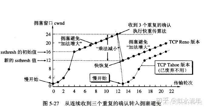 - 假定cwnd=24时,网络出现超时(拥塞),则更新后的ssthresh=12,cwnd重新设置为1,并执行慢开始算法。当cwnd=ssthresh=12时,改为执行拥塞避免算法。